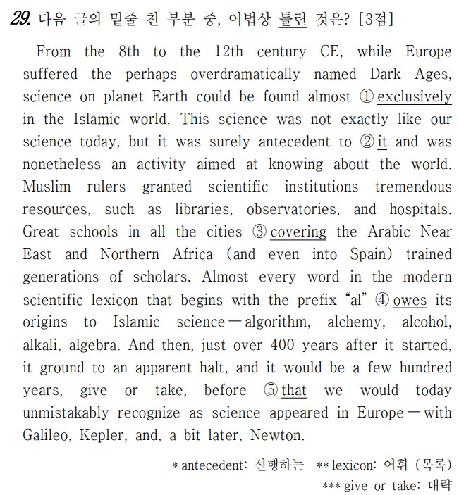 서기 8세기부터 12세기까지, 유럽이 아마도 지나치게 극적으로 이름 붙여진 암흑 시대를 겪은 동안, 지구상의 과학은 거의 이슬람 세계에서만 발견될 수 있었습니다. 이 과학은 오늘날 우리의 과학과 정확하게 같지는 않았지만, 그것은 확실히 그것을 ②하기 이전의 것이었고 그럼에도 불구하고 세계에 대해 아는 것을 목표로 하는 활동이었습니다. 무슬림 통치자들은 도서관, 천문대, 그리고 병원과 같은 과학 기관들에게 엄청난 자원을 주었습니다. 아랍어 근동과 북아프리카(그리고 스페인에도 진출)를 포함하는 모든 도시의 위대한 학교들은 세대의 학자들을 훈련시켰습니다. 현대의 거의 모든 단어들은 접두사 "al"로 시작하는 과학 어휘는 알고리즘, 연금술, 알코올, 알칼리, 대수학과 같은 이슬람 과학에 기원을 두고 있습니다. 그리고 나서, 그것이 시작된 지 400년이 조금 지난 후에, 그것은 명백한 정지에 이르렀습니다. 그리고 우리가 오늘날 갈릴레오, 케플러, 그리고 조금 후에, 뉴턴과 함께 과학이 유럽에 나타난 것처럼 확실히 인식하기까지는 몇백년이 걸릴 것입니다.