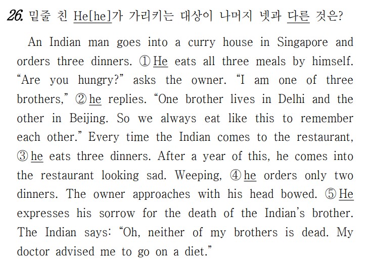 한 인도 남성이 싱가포르의 카레 집에 들어가 세 번의 저녁 식사를 주문합니다. ① 그는 세 끼를 모두 혼자 먹습니다. “배고프세요?” 주인이 묻습니다. “저는 세 형제 중 한 명입니다.”라고 그가 대답합니다. “한 형제는 델리에 살고 다른 형제는 베이징에 삽니다. 그래서 우리는 서로를 기억하기 위해 항상 이렇게 먹습니다.” 그 인디언은 식당에 올 때마다 저녁을 세 번 먹습니다. 1년 후, 그는 슬픈 표정으로 식당에 들어옵니다. 울면서, 그는 저녁을 두 번만 주문합니다. 주인이 고개를 숙이고 다가옵니다. ⑤ 그는 인디언의 형제의 죽음에 대한 슬픔을 표현합니다. 그 인디언은 이렇게 말합니다. “오, 제 형제들은 둘 다 죽지 않았어요. 의사 선생님께서 다이어트를 하라고 권하셨어요.