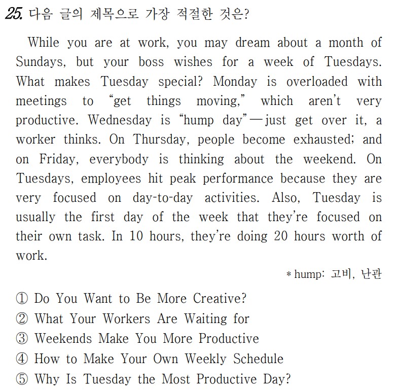 당신이 직장에 있는 동안, 당신은 한 달 정도의 일요일을 꿈꿀지도 모르지만, 당신의 상사는 한 주 동안의 화요일을 희망합니다. 무엇이 화요일을 특별하게 만드나요? 월요일은 “일을 진행시키기 위한” 회의로 가득 차 있는데, 이것은 그다지 생산적이지 않습니다. 수요일은 “햄프데이”입니다 – 그냥 극복하세요, 한 노동자가 생각합니다. 목요일에는 사람들이 지치고, 금요일에는 모두가 주말에 대해 생각하고 있습니다. 직원들은 낮과 낮의 활동에 매우 집중하기 때문에 화요일에는 최고의 성과를 달성합니다. 또한, 화요일은 보통 그들이 그들 자신의 일에 집중하는 한 주의 첫 번째 날입니다. 10시간 안에, 그들은 20시간 가치의 일을 합니다.
