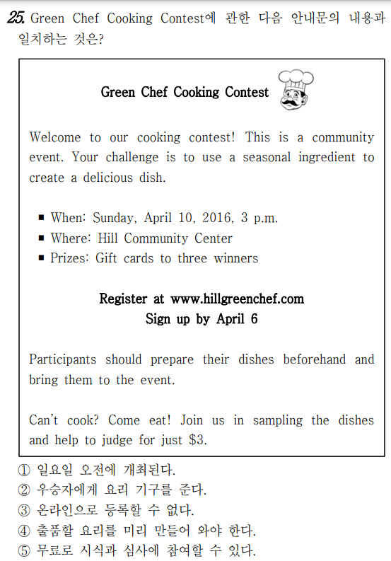 Green Chef 요리 대회 우리의 요리 대회에 어서 오십시오! 이 대회는 지역 사회 행사입니다. 여러분의 도전은 제철 요리 재료를 사용하여 맛있는 요리를 만들어내는 것입니다. ■ 일시: 2016년 4월 10일, 일요일, 오후 3시 ■ 장소: Hill 커뮤니티 센터 ■ 상품: 우승자 세 명에게 상품권 www.hillgreenchef.com에서 등록하십시오. 4월 6일까지 신청하십시오. 참가자들은 자기들의 요리를 미리 준비해서 행사에 가 져와야 합니다. 요리를 못하십니까? 와서 드십시오! 단 3달러로 시식 에 참여하고 심사도 도와주십시오.