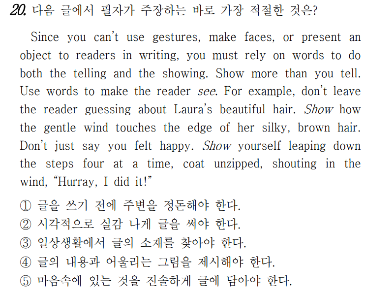 글을 쓸 때에는 몸짓을 사용하거나, 표정을 짓거나, 독자들에게 물건을 제시할 수 없으므로 말하고 보여주 는 일을 하는 것을 모두 어휘에 의존해야 한다. 말보 다는 보여 주는 것을 더 많이 하라. 독자들이 ‘볼’ 수 있도록 해주기 위해 어휘를 사용하라. 예를 들어, 독자가 Laura의 아름다운 머리카락에 대해 추측하게 두지 마라. 그녀의 비단 같은 갈색 머리카락 끝을 부드러운 바람이 어떻게 어루만지는지 ‘보여줘라’. 행복감을 느 꼈다고 단순히 말하지 마라. 여러분 자신이 계단을 한 번에 네 칸씩 뛰어 내려가고, 코트의 지퍼가 열린 채 로, 바람을 맞으며 “만세, 내가 해냈어!”라고 외치는 모 습을 ‘보여줘라’.