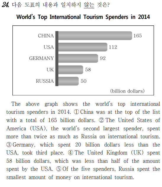 2014년 세계 최상위 국제 관광 소비 국가 위 도표는 2014년의 세계 최상위 국제 관광 소비 국가를 보여준다. 중국은 총 1,650억 달러로 목록의 최상위에 있었다. 세계에서 두 번째로 돈을 많이 소비 한 국가인 미국은 국제 관광에 러시아보다 두 배 더 많이 돈을 소비했다. 미국보다 200억 달러 더 적게 돈 을 소비한 독일은 3위를 차지했다. 영국은 580억 달러 를 소비했는데, 그것은 미국이 소비한 금액의 절반보 다 더 적었다(→ 많았다). 다섯 개의 소비 국가 중에 서, 러시아는 국제 관광에 가장 적은 금액의 돈을 소비했다