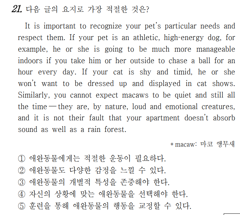 여러분의 애완동물의 특별한 욕구를 인식하고 그것 을 존중해 주는 것이 중요하다. 예를 들어, 여러분의 애완동물이 운동을 좋아하고, 에너지가 넘치는 개라면 매일 밖으로 데리고 나가서 한 시간 동안 공을 쫓아다 니게 하면 실내에서 다루기가 훨씬 더 쉬워질 것이다. 여러분의 고양이가 수줍음을 타고 겁이 많다면 의상을 차려입고 고양이 품평회 쇼에 나가서 자신의 모습을 보여주는 것을 원치 않을 것이다. 이와 비슷하게, 여러 분은 마코 앵무새가 항상 조용하고 가만히 있기를 기 대해서는 안 된다. 그들은 천성적으로 시끄럽고 감정 에 사로잡히기 쉬운 동물이며 여러분의 아파트가 열대 우림만큼 소리를 잘 흡수하지 못하는 것은 그들의 잘 못이 아니다.