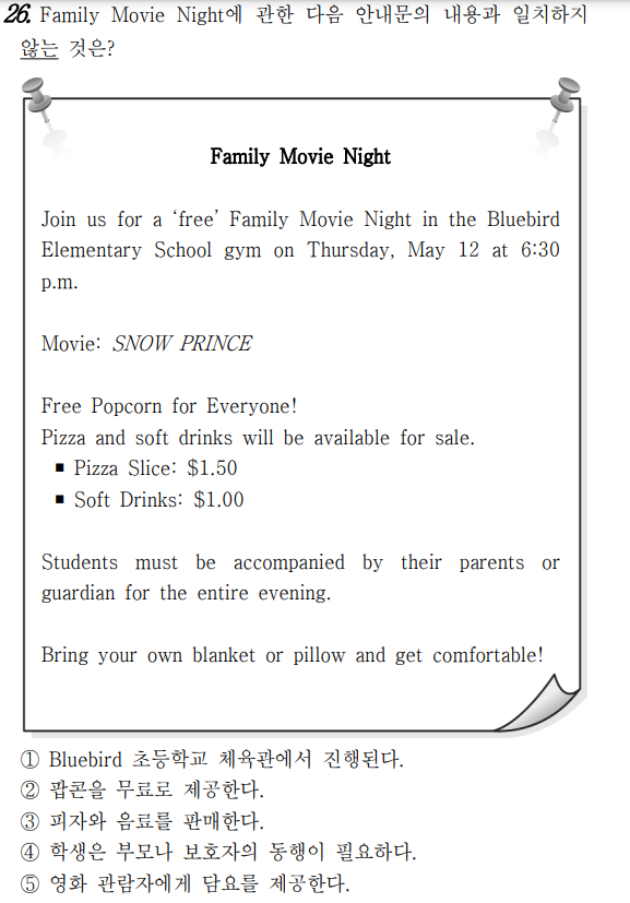 가족 영화의 밤 5월 12일 목요일 오후 6시 30분에 Bluebird 초등학 교 체육관에서 진행되는 ‘무료’ 가족 영화의 밤 행사에 우리와 함께하십시오. 영화: SNOW PRINCE 모든 분께 무료 팝콘 제공! 피자와 청량음료가 판매됩니다. 조각 피자: $1.50 청량음료: $1.00 학생은 저녁 시간 내내 부모나 보호자가 동행해야 합니다. 각자의 담요나 베개를 가져오시고 편안히 하시기 바 랍니다!
