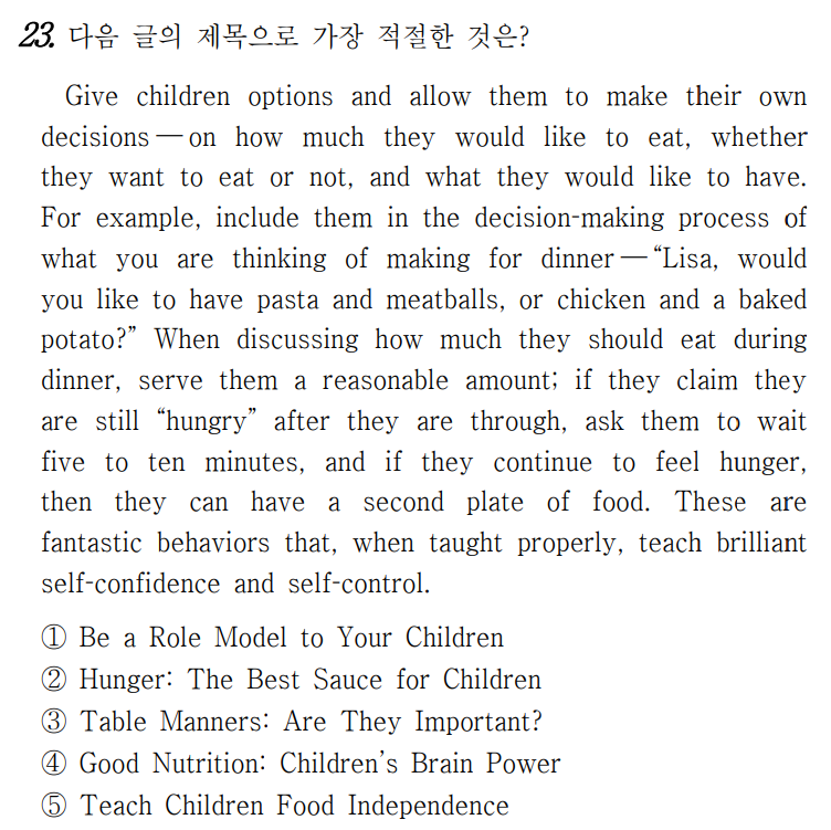 아이들에게 선택권을 주고 그들이 얼마나 많이 먹기 를 원할지, 그들이 먹고 싶어 할지 또는 아닐지, 그리 고 그들이 무엇을 먹기를 원할지에 대해 자신이 결정 하게 허락하라. 예를 들어 “Lisa야, 파스타와 미트볼을 먹고 싶니 아니면 닭고기와 구운 감자를 먹고 싶니?” 라고 여러분이 저녁 식사를 위해 만들려고 생각하고 있는 것에 대한 의사결정 과정에 그들을 포함하라. 그 들이 저녁 식사 동안 얼마나 먹어야 하는지를 의논할 때, 그들에게 적당량의 음식을 차려 줘라. 만약 그들이 (식사를) 끝낸 후에도 여전히 ‘배고프다’고 주장하면, 그들에게 5분에서 10분 동안 기다리라고 요청하고, 만 약 그들이 계속 허기를 느끼면, 그때 그들은 또 한 접 시의 음식을 먹을 수 있다. 제대로 배우면, 이것들은 훌륭한 자신감과 자기통제를 가르쳐 주는 멋진 행동이다