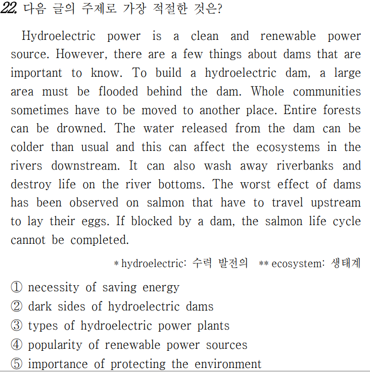 수력 발전은 깨끗하고 재생 가능한 에너지원이다. 하지만 알아두는 것이 중요한 댐에 관한 몇 가지가 있 다. 수력발전 댐을 건설하기 위해서, 댐 뒤의 넓은 지 역이 반드시 물에 잠기게 된다. 때때로 지역 사회 전 체가 다른 지역으로 이주되어야 한다. 숲 전체가 물에 잠길 수도 있다. 댐에서 방류된 물은 평소보다 더 차 서 이것이 하류의 강 생태계에 영향을 미칠 수 있다. 그것은 또한 강기슭을 유실되게 하고 강바닥의 생물을 파괴할 수도 있다. 댐의 가장 나쁜 영향은 알을 낳기 위해 흐름을 거슬러 올라가야 하는 연어에서 관찰되어 왔다. 댐으로 막히면, 연어의 라이프 사이클은 완결될 수 없다.
