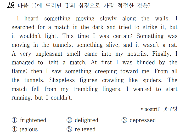 나는 무엇인가 벽을 따라 천천히 움직이는 소리를 들었다. 나는 어둠 속에서 성냥을 찾아서 그것을 켜려 고 했으나 불이 붙지 않았다. 이번에는 확신했다. 뭔가 살아 있는 것이 터널 속에서 움직이고 있었는데, 그것 은 쥐가 아니었다. 매우 불쾌한 냄새가 나의 콧구멍으 로 들어왔다. 마침내 나는 가까스로 성냥불을 켰다. 처 음에 나는 불꽃 때문에 볼 수가 없었다. 그러다가 나 는 뭔가가 나를 향해 기어 오는 것을 보았다. 모든 터 널로부터. 거미처럼 기어 오는 형체가 없는 것들. 떨리 는 나의 손가락에서 성냥이 떨어졌다. 나는 달아나고 싶었으나 그럴 수가 없었다.