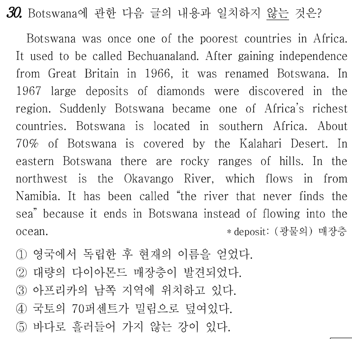 보츠와나는 한때 아프리카에서 가장 가난한 나라 중 하나였습니다.그것은 Bechuanaland라고 불렸습니다. 1966년 영국으로부터 독립한 후, 보츠와나로 이름이 바뀌었습니다. 1967년에 그 지역에서 거대한 다이아몬드 매장지가 발견되었습니다. 갑자기 보츠와나는 아프리카에서 가장 부유한 나라 중 하나가 되었습니다. 보츠와나는 아프리카 남부에 위치해 있습니다. 보츠와나의 약 70%가 칼라하리 사막으로 덮여 있습니다. 보츠와나 동부에는 바위투성이의 언덕들이 있습니다. 북서쪽에는 나미비아에서 유입되는 오카방고 강이 있습니다. 이 강은 바다로 흘러드는 대신 보츠와나에서 끝나기 때문에 "바다를 결코 찾지 못하는 강"이라고 불려왔습니다.