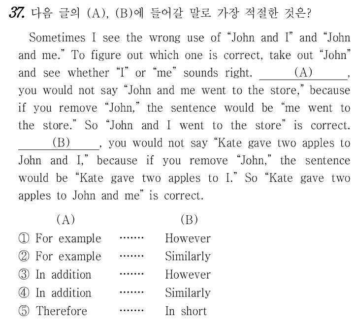 가끔 저는 "존과 나"와 "존과 나"의 잘못된 사용을 봅니다 어느 것이 옳은지 알아보려면 '존'을 꺼내 '나'와 '나' 중 어느 것이 옳은지 알아본다. (A) '존과 나는 가게에 갔다'고 말하지 않을 것이다. 왜냐하면 '존'을 빼면 '나는 가게에 갔다'는 문장이 되기 때문이다 그래서 "존과 나는 가게에 갔다"가 맞습니다. (B) "케이트가 존과 나에게 사과 두 개를 주었다"고 말하지 않을 것입니다. 왜냐하면 "존"을 제거하면 "케이트가 나에게 사과 두 개를 주었다"는 문장이 될 것이기 때문입니다 그래서 "케이트는 존과 나에게 사과 두 개를 주었습니다"가 맞습니다.