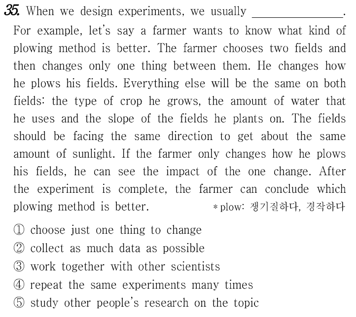우리가 실험을 설계할 때, 우리는 보통.예를 들어, 농부가 어떤 종류의 경작 방법이 더 나은지 알고 싶어 한다고 가정해 보겠습니다. 농부는 두 개의 밭을 선택한 다음 그들 사이에서 한 가지만 바꿉니다. 그는 자신의 밭을 가는 방법을 바꿉니다. 그가 재배하는 작물의 종류와 사용하는 물의 양과 그가 심는 밭의 경사 등, 두 밭의 모든 것이 같을 것입니다. 들판은 같은 양의 햇빛을 받기 위해 같은 방향을 향해야 합니다. 농부가 밭을 가는 방법만 바꾼다면, 한 가지 변화의 영향을 볼 수 있습니다. 실험이 완료된 후 농부는 어떤 경작 방법이 더 나은지 결론을 내릴 수 있습니다.