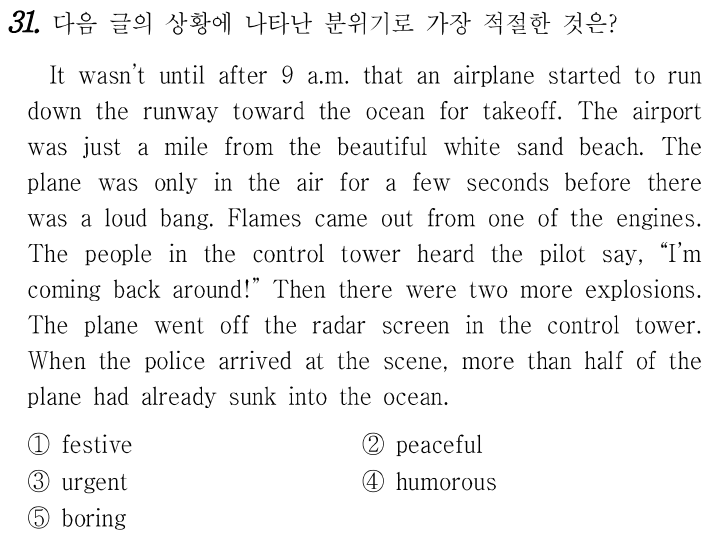 오전 9시가 넘어서야 비행기 한 대가 이륙을 위해 바다를 향해 활주로를 달리기 시작했습니다. 공항은 아름다운 백사장에서 불과 1마일 떨어진 곳에 있었습니다. 비행기는 요란한 쾅 소리가 나기 전에 몇 초 동안 공중에 떠 있었습니다. 엔진 중 하나에서 불꽃이 나왔습니다. 관제탑에 있는 사람들은 조종사가 "나는 돌아오고 있어!"라고 말하는 것을 들었습니다 그리고 두 번의 폭발이 더 있었습니다. 비행기가 관제탑의 레이더 화면을 벗어났습니다. 경찰이 현장에 도착했을 때, 비행기의 절반 이상이 이미 바다에 가라앉아 있었습니다.
