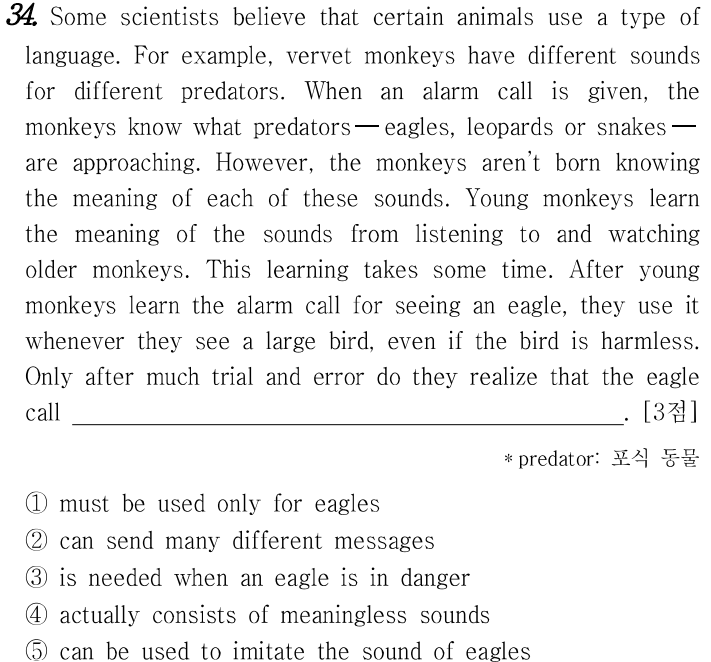 어떤 과학자들은 특정한 동물들이 어떤 종류의 언어를 사용한다고 믿습니다. 예를 들어, 버벳 원숭이들은 다른 포식자들을 위한 다른 소리를 가지고 있습니다. 경보가 울리면 원숭이들은 독수리, 표범, 뱀 등 포식자들이 무엇을 향해 접근하고 있는지 알게 됩니다. 하지만, 이 원숭이들은 이러한 각각의 소리의 의미를 알고 태어난 것이 아닙니다. 어린 원숭이들은 나이든 원숭이들을 듣고 보면서 소리의 의미를 배웁니다. 이 학습은 시간이 좀 걸립니다. 어린 원숭이들이 독수리를 보는 경보음을 배운 후, 그들은 큰 새를 볼 때마다 그 새가 무해할지라도 그것을 사용합니다. 많은 시행착오를 겪은 후에야 그들은 독수리가 부른다는 것을 깨닫습니다.
