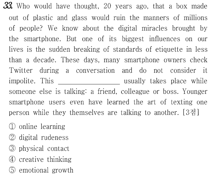 20년 전에 플라스틱과 유리로 만들어진 상자가 수백만의 사람들의 매너를 망칠 거라고 누가 생각했을까요? 우리는 스마트폰이 가져온 디지털 기적에 대해 알고 있습니다. 하지만 우리의 삶에 가장 큰 영향을 미치는 것 중 하나는 10년도 안 되어 갑자기 에티켓의 기준을 깬 것입니다. 요즘, 많은 스마트폰 소유자들은 대화 중에 트위터를 확인하고 그것을 무례하게 여기지 않습니다. 이것은 보통 다른 사람이 이야기하는 동안 발생합니다: 친구, 동료 또는 상사. 젊은 스마트폰 사용자들은 심지어 그들 자신이 다른 사람과 대화하는 동안 한 사람에게 문자를 보내는 기술을 배웠습니다.