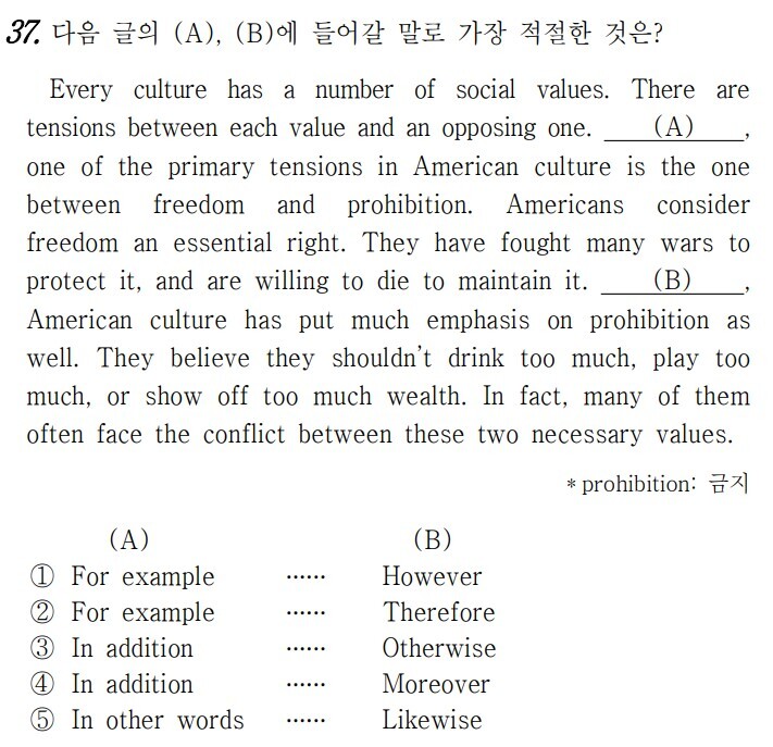 모든 문화는 많은 사회적 가치를 가지고 있다. 각각의 가치와 반대되는 가치 사이에는 긴장이 있다. (A) 미국 문화의 주요 긴장 중 하나는 자유와 금지 사이의 긴장이다. 미국인들은 자유를 필수적인 권리로 여긴다. 그들은 그것을 보호하기 위해 많은 전쟁을 치렀고, 그것을 유지하기 위해 기꺼이 죽을 것이다. (B) 미국 문화는 또한 금지에 많은 중점을 두었다. 그들은 너무 많이 마시거나, 너무 많이 놀거나, 너무 많은 부를 과시해서는 안 된다고 믿습니다. 사실, 그들 중 많은 사람들은 종종 이 두 가지 필요한 가치 사이의 갈등에 직면한다.
