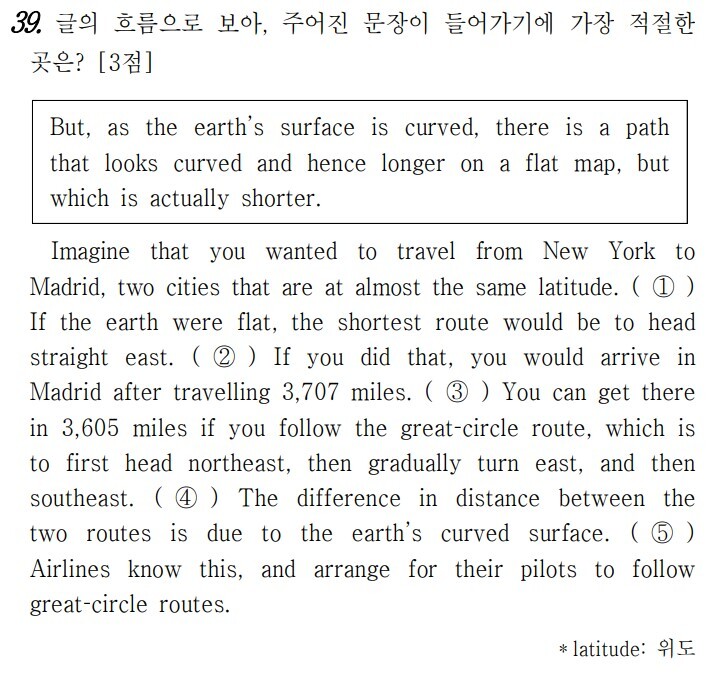 하지만, 지구의 표면이 곡선을 그리면서, 평평한 지도에서 곡선으로 보이고 따라서 더 길어 보이는 길이 있지만, 실제로는 더 짧습니다. 당신이 뉴욕에서 뉴욕까지 여행하고 싶어했다고 상상해보세요. 마드리드, 위도가 거의 같은 두 도시. ( ① ) 만약 지구가 평평하다면, 가장 짧은 경로는 곧장 동쪽으로 향하는 것입니다. ( ② ) 만약 당신이 그렇게 한다면, 당신은 3,707마일을 여행한 후에 마드리드에 도착할 것입니다. ( ③ ) 처음에는 북동쪽으로 향하다가 점차 동쪽으로 방향을 틀어 남동쪽으로 향하는 대순환로를 따라가면 3605마일 안에 도착할 수 있습니다. ( ④ ) 두 경로 사이의 거리 차이는 지구의 곡면 때문입니다. ( ⑤ ) 항공사들은 이것을 알고 있으며, 조종사들이 큰 순환 경로를 따르도록 준비합니다.