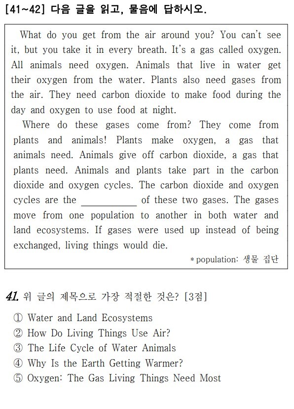 당신은 당신 주위의 공기로부터 무엇을 얻습니까? 보이지는 않지만 숨을 쉴 때마다 들이마십니다. 그것은 산소라고 불리는 가스입니다. 모든 동물들은 산소를 필요로 합니다. 물에 사는 동물들은 물로부터 산소를 얻습니다. 식물들은 또한 공기로부터 가스를 필요로 합니다. 그들은 낮에는 음식을 만들기 위해 이산화탄소가 필요하고 밤에는 음식을 사용하기 위해 산소가 필요합니다.이 가스들은 어디에서 오는 것입니까? 그들은 출신입니다. 식물과 동물들! 식물들은 동물들이 필요로 하는 가스인 산소를 만듭니다. 동물들은 식물이 필요로 하는 가스인 이산화탄소를 배출합니다. 동물과 식물은 이산화탄소와 산소 순환에 참여합니다. 이산화탄소와 산소의 순환은 이 두 기체 중 하나입니다. 그 가스들은 물과 육지 생태계 모두에서 한 개체군에서 다른 개체군으로 이동합니다. 만약 가스가 교환되는 대신에 다 사용된다면, 생물들은 죽을 것입니다.