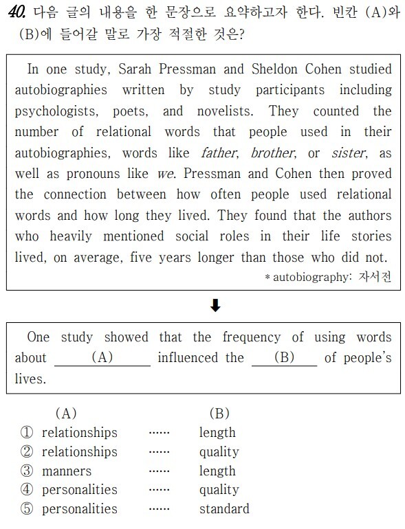 한 연구에서, 사라 프레스먼과 셸던 코헨은 심리학자, 시인, 소설가를 포함한 연구 참가자들에 의해 쓰여진 자서전을 연구했습니다. 그들은 사람들이 자서전에서 사용한 관계형 단어, 아버지, 형제, 자매와 같은 단어, 그리고 우리와 같은 대명사의 수를 세었습니다. 프레스먼과 코헨은 사람들이 얼마나 자주 관계형 단어를 사용하는지와 그들이 얼마나 오래 사는지 사이의 연관성을 증명했습니다. 그들은 그들의 인생 이야기에서 사회적 역할을 많이 언급한 작가들이 그렇지 않은 작가들보다 평균적으로 5년 더 오래 살았다는 것을 발견했습니다.