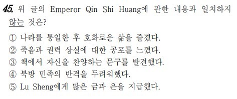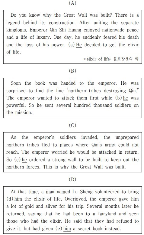 여러분은 만리장성이 왜 지어졌는지 알고 있나요? 그것의 건축 뒤에는 전설이 있습니다. 별도의 왕국을 통합한 후, 진시황은 전국적인 평화와 사치스러운 삶을 즐겼습니다. 어느 날, 그는 갑자기 그의 죽음과 그의 힘의 상실을 두려워했습니다. (a) 그는 생명의 영약을 얻기로 결심했습니다. (B) 곧 그 책은 황제에게 넘겨졌습니다. 그는 “북족이 진을 멸망시킨다”는 선을 발견하고 깜짝 놀랐습니다. 황제는 그가 강대한 동안 그들을 먼저 공격하기를 원했습니다. 그래서 그는 그 임무에 수십만 명의 병사를 보냈습니다.(C) 황제의 군사들이 쳐들어오자 준비되지 않은 북방 부족들은 진나라 군대가 접근할 수 없는 곳으로 도망쳤습니다. 황제는 그 대가로 공격을 받을 것을 걱정했습니다. 그래서 (c) 그는 북쪽 군대를 막기 위해 튼튼한 벽을 쌓으라고 명령했습니다. 이것이 만리장성이 세워진 이유입니다. (D) 그때, 루성이라는 사람이 그에게 생명의 영약을 가져다 주겠다고 자원했습니다. 너무 기뻐서, 황제는 그의 여행을 위해 많은 금과 은을 주었습니다. 몇 달 후에 그는 돌아와서 그가 요정의 나라에 가서 영약을 가진 사람들을 보았다고 말했습니다. 그는 그들이 그것을 주기를 거부했지만 대신에 (e) 그에게 비밀 책을 주었다고 말했습니다.