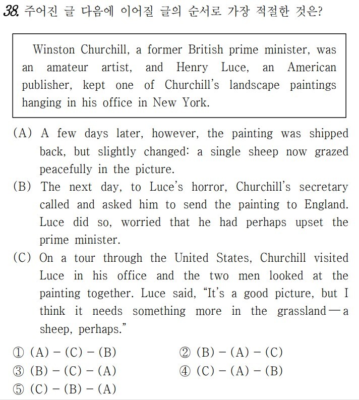 영국 총리였던 윈스턴 처칠은 아마추어 예술가였고, 미국 출판인 헨리 루스는 뉴욕 사무실에 처칠의 풍경화 한 점을 걸어두었습니다. (A) 그러나 며칠 후에 그림은 다시 발송되었지만 약간 바뀌었습니다: 이제는 양 한 마리가 평화롭게 사진에서 풀을 뜯었습니다. (B) 다음날, 루체를 놀라게 한 것은, 처칠의 비서가 전화를 걸어 그에게 그 그림을 영국으로 보내달라고 부탁했다는 것입니다. 루스는 그가 총리를 화나게 했을지도 모른다고 걱정하며 그렇게 했습니다. (C) 처칠은 미국을 여행하는 동안 그의 사무실에 있는 루체를 방문했고 두 남자는 함께 그 그림을 보았습니다. 루스는 “그것은 좋은 그림이지만, 저는 그것이 초원에서 무언가 더 필요하다고 생각합니다 – 아마도 양.”라고 말했습니다