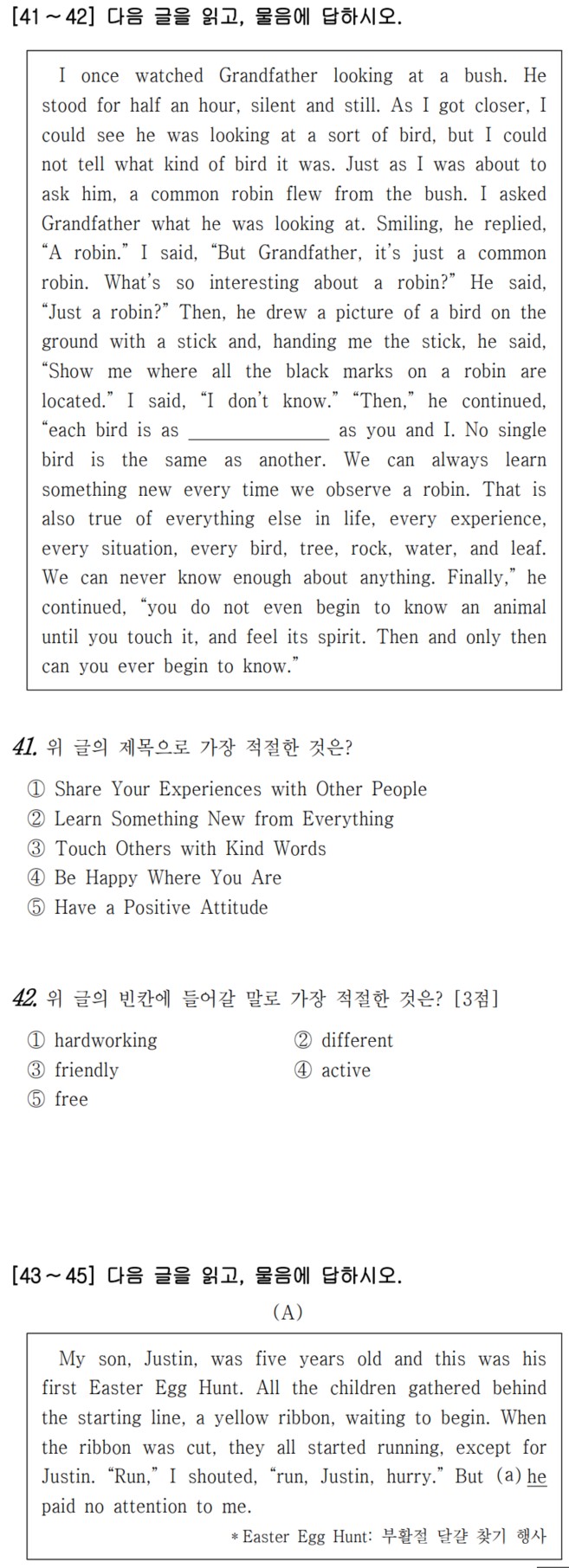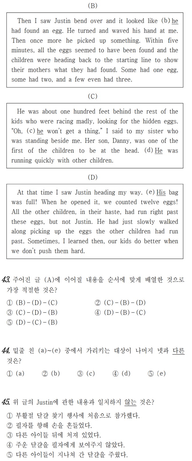 (A) 우리 아들 Justin은 다섯 살이었고 부활절 달걀 찾기 행사에 처음으로 참여했다. 출발선인 노란 리본 뒤에서 출발하기를 기다리며 모든 아이들이 모여 있었 다. 리본이 잘리자 Justin을 제외한 모든 아이들은 달 리기 시작하였다. “달려, 달려, Justin, 서둘러.”라고 나 는 소리쳤다. 하지만 그는 내 말에 주의를 기울이지 않았다. (C) 숨겨진 달걀을 찾으며 맹렬히 달리고 있는 다른 나머지 아이들보다 그는 약 100피트 정도 뒤처져 있 었다. 나는 “아, 그는 하나도 찾지 못할 거야.”라고 옆에 서 있던 여동생에게 말했다. 여동생의 아들인 Danny는 선두에서 앞장서 달리고 있는 아이들 중 하나였다. 그 는 다른 아이들과 함께 빨리 달리고 있었다. (B) 그 때 나는 Justin이 몸을 숙이는 것을 보았고 그가 달걀 하나를 찾은 것처럼 보였다. 그는 돌아서서 나를 향해 손을 흔들었다. 그런 다음 그는 다시 한 번 무언가를 집어 들었다. 5분 안에, 모든 달걀이 발견된 것 같았고 아이들은 찾은 것을 엄마에게 보여주기 위 해 출발선으로 돌아오고 있었다. 몇 명은 달걀을 하나 찾았고, 몇 명은 두 개를 찾았으며, 심지어 세 개를 찾 은 아이도 몇 있었다. (D) 그때 Justin이 나에게로 돌아오는 것이 보였다. 그의 가방은 가득 차 있었다! 그가 가방을 열었을 때 세어 보니 12개의 달걀이 있었다! 다른 아이들은 모두 서두르느라 이 달걀들을 바로 지나쳐 달렸지만 Justin 은 그렇지 않았다. 그는 다른 아이들이 달려 지나쳐 버린 달걀을 주우면서 그냥 천천히 걸었다. 나는 그때, 때때로 아이들을 심하게 다그치지 않으면 아이들은 더 잘한다는 것을 배웠다.