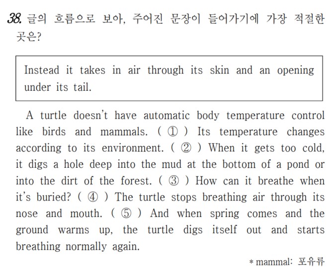 거북은 조류와 포유류처럼 체온을 자동으로 조절하 는 능력이 없다. 거북의 체온은 주위 환경에 따라 변 한다. 날씨가 너무 추워지면, 거북은 연못 바닥의 진흙 이나 숲의 흙 속 깊이 구멍을 판다. 흙 속에 묻히면 거북은 어떻게 숨을 쉴 수 있을까? 거북은 코와 입으 로 숨 쉬는 것을 멈춘다. 대신 거북은 피부와 꼬리 아 래에 있는 구멍을 통해 공기를 받아들인다. 그리고 봄 이 와서 땅이 따뜻해지면, 거북은 땅을 파고 나와 다 시 평소대로 숨 쉬기 시작한다.