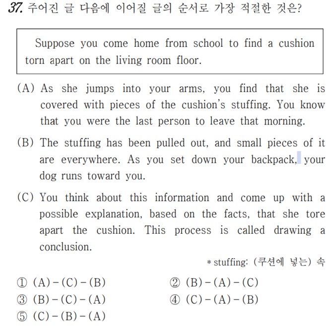 학교에서 돌아왔는데 쿠션이 거실 바닥에 갈가리 찢 어진 채로 있는 것을 발견했다고 가정해 보라. (B) 쿠 션 속이 밖으로 빠져나와 있고 작은 속 조각들이 여기 저기에 있다. 가방을 내려놓을 때, 개가 당신을 향해 달려온다. (A) 개가 당신의 품속으로 뛰어들 때 당신 은 개가 쿠션 속 조각들로 뒤덮여 있는 것을 발견한 다. 당신은 자신이 그날 아침 집을 나간 마지막 사람 임을 알고 있다. (C) 당신은 이런 정보에 대해 생각해 보고, 사실에 기초하여, 개가 쿠션을 찢어 놓았다는 가능한 설명을생각해 낸다. 이 과정은 결론 도출하기라 고 불린다.