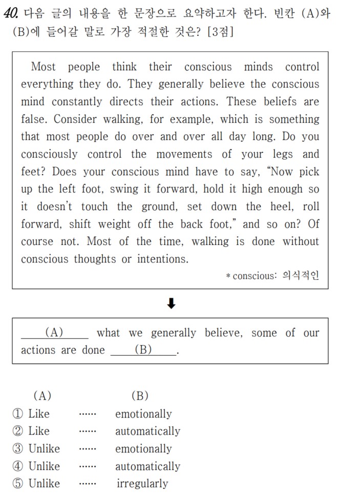 대부분의 사람들은 의식적인 생각이 자신들이 하는 모든 것을 통제한다고 생각한다. 그 사람들은 일반적 으로 의식적인 생각이 행동을 끊임없이 지시한다고 믿 는다. 이러한 믿음은 잘못된 것이다. 예를 들어, 대부 분의 사람들이 하루 종일 반복적으로 하는 걷기를 생 각해보라. 다리와 발의 움직임을 의식적으로 통제하는 가? 의식적인 생각이 “자, 왼쪽 발을 들어 올려 앞으로 내밀고 땅에 닿지 않을 만큼 높이 들어서 뒤꿈치를 내 려놓은 다음 앞으로 구르듯이 나아가고 뒷발로부터 무 게를 이동시켜라” 등의 말을 해야 하는가? 물론 그렇 지 않다. 대부분의 시간 동안 걷기는 의식적인 생각이 나 의도 없이 행해진다. → 우리가 일반적으로 믿는 바와 달리, 우리 행동의 일부는 자동적으로 일어난다.