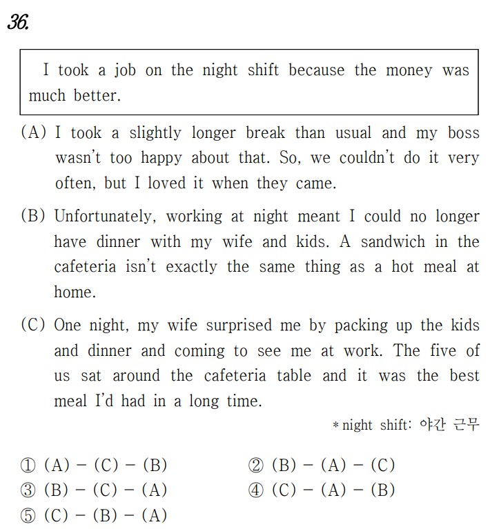 나는 (야간 근무의) 보수가 훨씬 더 나았기 때문에 야간에 근무하는 일을 맡았다. (B) 불행히도, 밤에 일하는 것은 내가 더는 아내와 아이들과 함께 저녁을 먹을 수 없다는 것을 의미했다. 구내식당의 샌드위치는 집의 따뜻한 식사와 똑같은 것은 아니다. (C) 어느 날 밤, 아내는 아이들을 챙기고 저녁을 싸서 직장에 있는 나를 보러 와 나를 놀라게 했다. 우리 다섯은 구내식