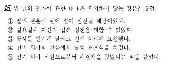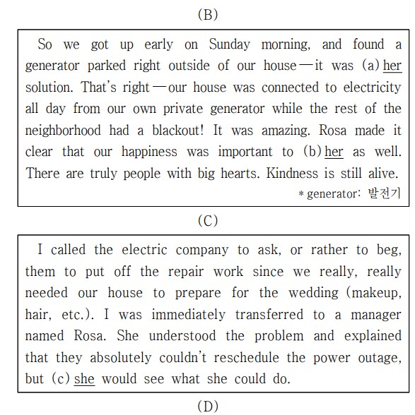 (A) 내 남편 David는 우리 딸 결혼식 한 주 전에 내 휴대전화로 전화를 걸어 “우리에게 문제가 생겼어요.”라고 말했다. 그는 전기 회사에서 중요한 수리를 하기 위해서 앞으로 우리가 사는 인근 지역에 정전이 있을 거라고 발표했다고 나에게 말했다. 진짜 문제는 결혼식 날에 우리가 정전을 겪을 거라는 사실이었다.(C) 나는 전기 회사에 전화를 걸어서 우리가 결혼식 준비(화장, 머리 단장하기 등)를 하기 위해서 아주 정말로 집이 필요하므로 수리 작업을 연기해 달라고 그들에게 부탁, 아니 오히려 사정했다. 내 전화는 즉시 Rosa라는 관리자에게 연결되었다. 그녀는 그 문제를 이해했으며 그들은 도저히 정전 계획을 다시 세울 수는 없으나 자신이 어떤 조치를 취할 수 있을지 알아보겠다고 설명했다. (D) 이틀 후에 Rosa는 전화를 걸 우리 집만 전기를 유지하게 해줄 수는 없다고 말했다. 그런 다음에 그녀는 “우리 회사 건물에 있는 방을 사용할 수 있게 해드릴 수 있습니다.”라고 말했다. 나는 놀라면서 그녀가 그렇게 한 적이 있었는지 물었다. 그녀는 “사실은, 전에 그런 일이 있었습니다.”라고 말했다. 그 다음 날에 Rosa는 기쁜 목소리로 다시 전화를 걸어 해결책을 찾았다고 말했다. 그녀는 나의 딸 집에서 전기를 사용할 수 있고 자신의 결혼식 준비를 할 수 있을 거라고 나에게 말했다. (B) 그리하여 우리는 일요일 아침에 일찍 일어났으며 우리 집 바로 밖에 발전기가 놓여있는 있는 것을 발견했는데, 그것이 그녀의 해결책이었다. 그렇다, 인