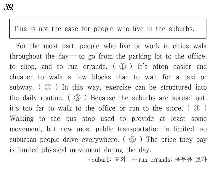 대부분의 경우에, 도시에서 살거나 일하는 사람들은 주차장에서 사무실까지 가기 위해서, 쇼핑하기 위해서, 그리고 용무를 보기 위해서 온종일 걷는다. 택시나 지하철을 기다리는 것보다 몇 블록을 걷는 것은 흔히 더 수월하고 비용이 덜 든다. 이런 식으로 운동이 일과 속에 구조화될 수 있다. 이것은 교외에 사는 사람들에게는 해당하는 일이 아니다. 교외는 넓게 펼쳐져 있기 때문에 사무실까지 걸어가거나 상점까지 뛰어가기에는 너무 멀다. 버스 정류장까지 걸어가는 것이 적어도 약간의 운동을 제공해 주곤 했지만, 지금은 대부분의 대중교통이 제한적이어서 교외에 사는 사람들은 어디든 운전을 하고 다닌다. 그들이 치러야 하는 대가는 하루 동안 신체적 운동이 제한적이라는 것이다.