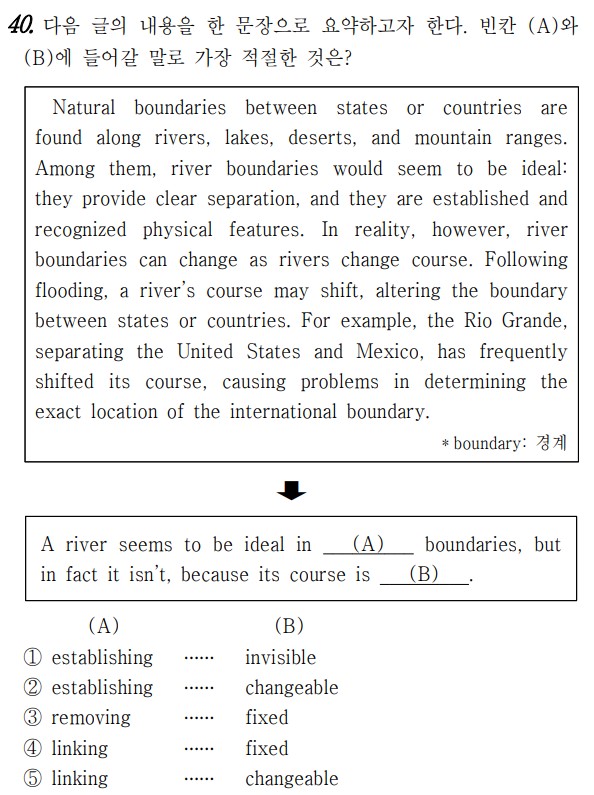 이의 경계를 바꿀 수 있다. 예를 들어, 미국과 멕시코를 구분 짓는 리오그란데 강은 경로를 빈번하게 바꾸어, 국가 간 경계의 정확한 위치를 결정하는 데 문제를 일으켰다.→ 강은 경계를 확립하기에 이상적인 것처럼 보이지만, 사실은 그렇지 않은데, 그 이유는 그것의 경로가 변할 수도 있기 때문이다.