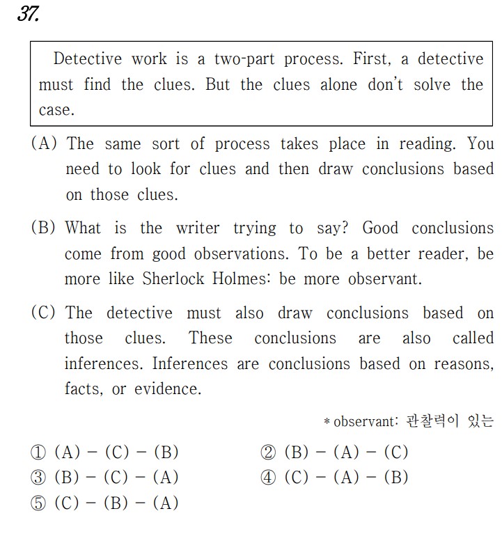 단서를 바탕으로 결론을 도출해야 한다. (B) 글쓴이가 무엇을 말하고자 하는가? 좋은 결론은 좋은 관찰로부터 나온다. 더 나은 독자가 되기 위해서 셜록 홈스처럼 되라. 즉, 더욱 관찰력을 길러라.