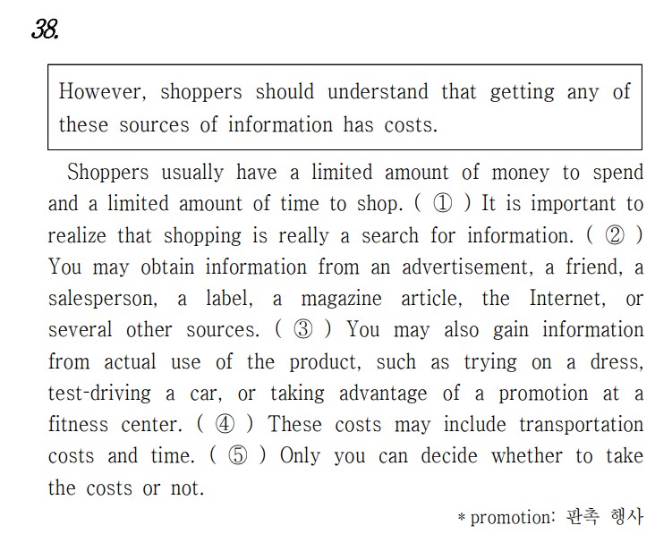 쇼핑객들은 보통 지출할 수 있는 돈의 양이 한정되어 있고, 쇼핑할 수 있는 시간도 한정되어 있다. 쇼핑이 사실 정보 검색이라고 깨닫는 것은 중요하다. 여러분은 광고, 친구, 판매원, 라벨, 잡지 기사, 인터넷, 또는 몇몇 다른 출처에서 정보를 얻 수 있다. 여러분은 또한 옷을 입어보거나, 자동차 시험 운전을 해보거나, 헬스클럽에서 판촉 행사를 이용하는 것 같이 그 제품을 직접 사용하는 것에서 정보를 얻을 수도 있다. 그러나 쇼핑객들은 이러한 정보의 출처 중에서 어떤 것을 얻는 것에는 비용이 든다는 것을 이해해야 한다. 이러한 비용에는 교통비와 시간이 포함될 수 있다. 오직 여러분만이 그 비용을 감수할지 말지를 결정할 수 있다.