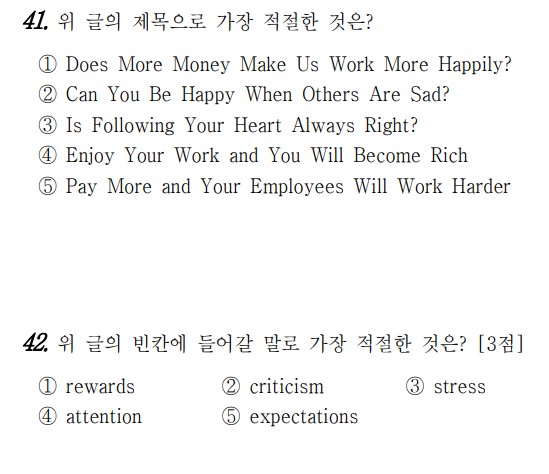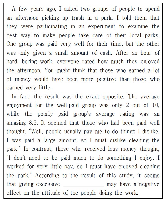 몇 년 전에 나는 두 그룹의 사람들에게 어느 오후 시간을 공원에서 쓰레기를 주우며 보내 달라고 부탁했었다. 나는 그들에게 사람들이 자신들의 지역 공원을 돌보게 하는 가장 좋은 방법을 조사하기 위한 실험에 참가하는 것이라고 말했다. 한 그룹에는 그들이 보낸 시간에 대해 후하게 보수가 지급되었지만, 다른 그룹에는 단지 적은 액수의 현금이 지급되었다. 1시간 동안 힘들고 지루한 일을 하고 난 후에 모두가 자신들이 오후 시간을 얼마나 즐겼는지 등급을 매겼다. 여러분은 많은 돈을 번 사람이 매우 적은 돈을 번 사람보다 더 긍정적이었을 것으로 생각할 수도 있다. 사실, 결과는 정반대였다. 후하게 보수를 받은 그룹에서의 평균적 기쁨은 10에서 2밖에 안 되었지만, 매우 적게 보수를 받은 그룹의 평균 등급은 놀랍게도 8.5였다. 후하게 보수를 받은 사람들은 “음, 사람들은 대체로 내가 싫어하는 일을 시키기 위해 돈을 주지. 내가 많은 돈을 받았으, 나는 공원 청소 하는 것을 틀림없이 싫어하는 거야.”라고 생각한 것 같았다. 대조적으로 더 적은 돈을 받은 사람들은 “내가 즐기는 어떤 것을 하기 위해 나는 많은 보수를 받을 필요는 없어. 나는 아주 적은 돈을 받고 일을 했으니, 내가 공원을 청소하는 것을 즐겼음이 틀림없어.”라고 생각했다. 이 연구 결과에 의하면 지나친 보상을 주는 것이 그 일을 하는 사람의 태도 부정적 영향을 줄 수 있다는 것을 보여 주는 것 같다.